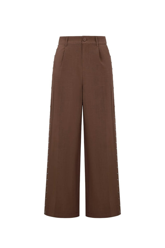 Calças Tachas Poliéster Perna Larga - Pantalona Feminina Elegante